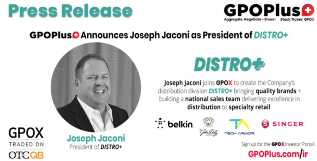 LAS VEGAS, NV (September 21, 2022) GPO Plus, Inc. (OTCQB: GPOX), a publicly traded company of diversified Group Purchasing Organizations (GPOs) uses the power of Group Purchasing to save businesses money, announced Joseph Jaconi has been appointed President of DISTRO+, GPOX’s distribution division and GPO for specialty retailers.